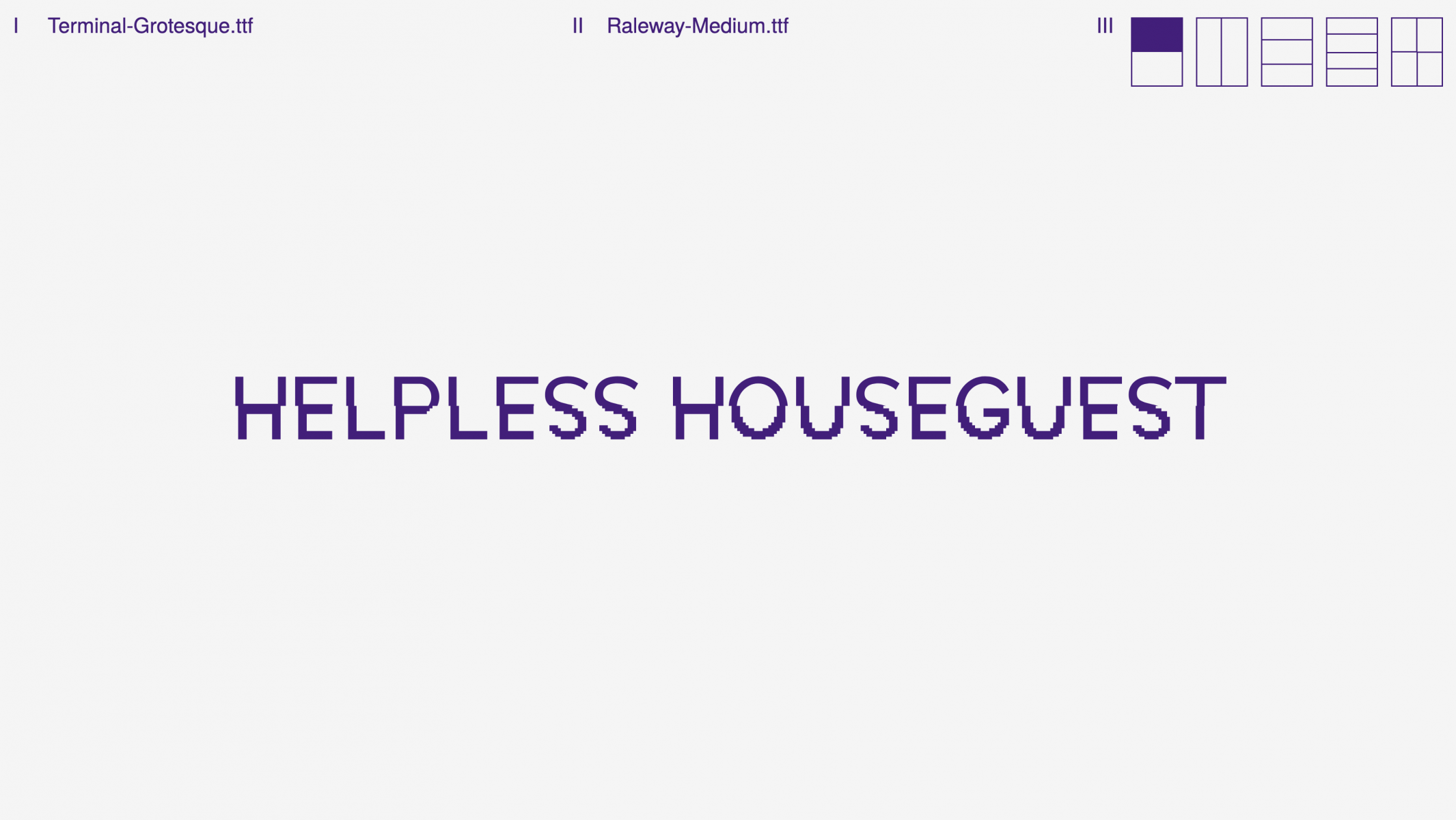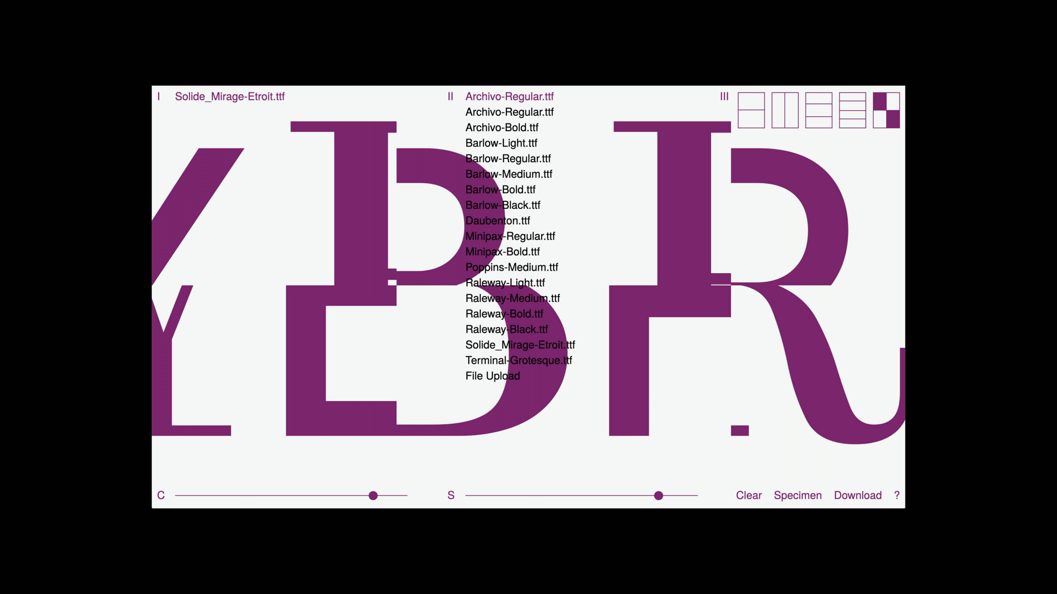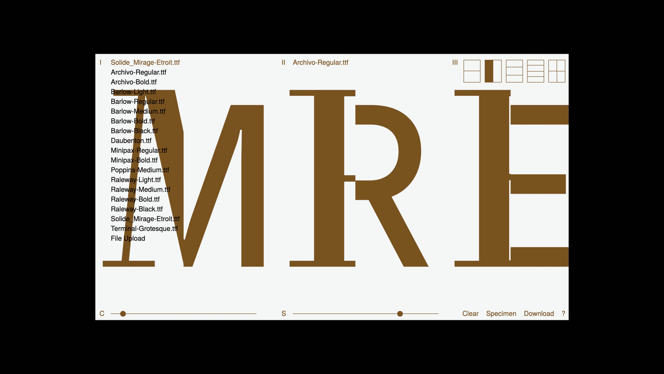 Font-remix is a web-based experiment that proposes the process of configuring letter forms at runtime and generating a customized font file for download. Using opentype.js and performing boolean operations on the vector letterforms, two open source typefaces are combined according to a set of grids.
